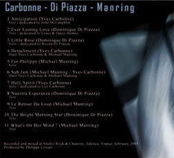 2 Ever Lasting Love (Dominique Di Piazza) - Trio - dedicated to Louis & Janey Deméo 3 Little Rose (Dominique Di Piazza) - Solo - dedicated to Rosita Di Piazza 4 Detachment (Yves Carbonne) - Duet Yves Carbonne & Michael Manring 5 For Philippe (Michael Manring) - Solo 6 Sub Jam (Michael Manring / Yves Carbonne) - Duet Yves Carbonne & Michael Manring 7 Holy Spirit (Yves Carbonne) - Solo - dedicated to Léo Carbonne 8 Nuestra Esperanza (Dominique Di Piazza) - Trio 9 Le Retour Du Loup (Michael Manring) - Trio 10 The Bright Morning Star (Dominique Di Piazza) - Trio 11 What's On Her Mind ? (Michael Manring) - Trio